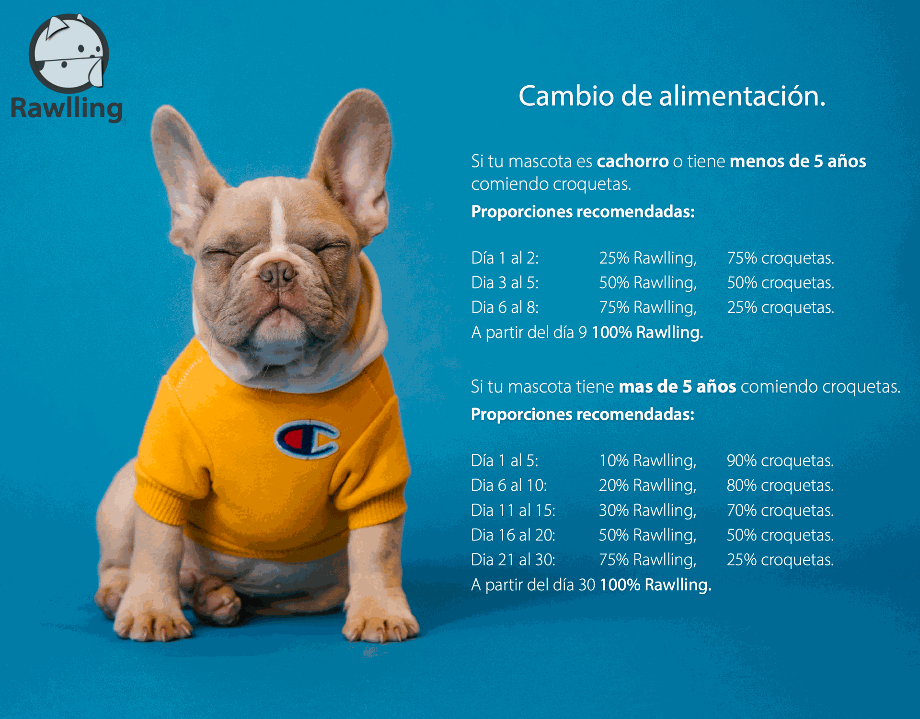 - Para mascotas mayores de 5 años: incrementar la proporción de Rawlling en un 10% cada 3 a 5 días.